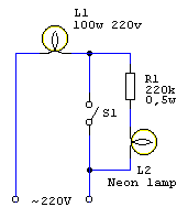 Схема предлагаемого устройства собрана всего из двух деталей, собрать ее не составит труда даже начинающему электронщику. В основе схемы (см. рисунок) - неоновая лампа L2. При выключенном светильнике ток проходит через нить накала его лампы L1 и через сопротивление R1, на котором гаситься больше половины напряжение, и поступает на неонку L2. При этом неоновая лампа светиться. Как только контакты выключателя S1 замыкаются неонка гаснет и включается светильник в Вашем коридоре. |