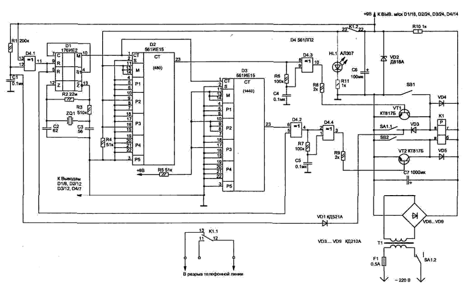 Схема таймера не меняет режимов при кратковременном исчезновении сетевого напряжения. Но для того, чтобы работа таймера не нарушалась при длительном отсутствии сетевого напряжения, необходимо применять элемент резервного питания (9В), от которого достаточно питать только микросхемы.