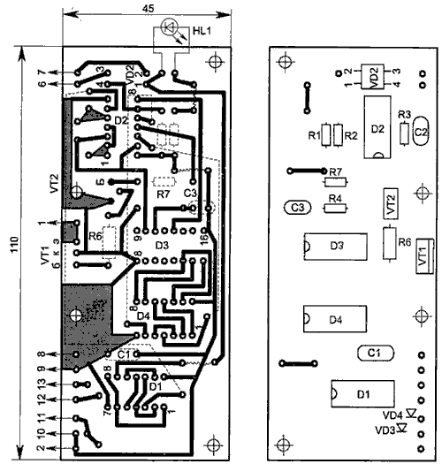 Для выполнения всех этих функций в схему добавлены узлы: ограничителя времени звучания звукового сигнала на счетчике D5; триггера на элементах D6 для обеспечения режима ожидания начала отсчета временного интервала 12 секунд. Светодиод HL1 и пьезоизлучатель HF1 позволяют более полно контролировать режимы работы устройства, что удобно при эксплуатации. В начальный момент включения питания схемы (А1) импульс, сформированный цепью C4-R5, обеспечивает обнуление счетчика D5 (на выходе D5/7 появится логическая "1", т. е. напряжение питания). При этом на выводах элементов схемы будут состояния: D6/10 — лог. "1"; D1/1 — "0"; D1/2 — "0"; D1/3 ~ "1"; D7/1 — "О"; D7/13 — "0". После срабатывания датчика F1 на выводе D6/9 появится лог. "1" (D6/10 — "О"), что приведет к появлению на выходе D1/3 лог. "О". Начнет работать генератор и связанный с ним счетчик D3, до момента времени (12 секунд), пока на D4/10 не появится лог. "О" (на D1/3 —лог. "1", что остановит работу генератора). При этом схема переходит в режим ОХРАНА и будет находиться в таком состоянии, пока не сработает любой датчик. Если сработает один из датчиков F1 или F2 (когда схема находится в режиме ОХРАНА), это приведет к переключению триггера на элементах D1.1...D1.3 (на выводе D1/4 появится лог. "1", а на выводе D1/3 — "О"), что включит работу генератора и счетчика D3. В этом случае через 6 секунд появится звуковой сигнал оповещения (ВА1). За этот интервал времени необходимо отключить блок охраны, что, не зная места расположения тумблера SA1, сделать постороннему невозможно. При срабатывании датчика F3 звуковой сигнал появится без задержки. Когда блок охраны работает в режиме ОПОВЕЩЕНИЕ, кроме звукового сигнала, будет красным цветом светиться индикатор HL1. Сдвоенный светодиод HL1 можно заменить двумя любыми обычными светодиодами с разным цветом свечения. Для того чтобы снизить ток потребления схемой при работе светодиода в режиме индикации, напряжение на него подается импульсами. Из-за инерции зрения это незаметно. Топология печатной платы (gif 20Кб).