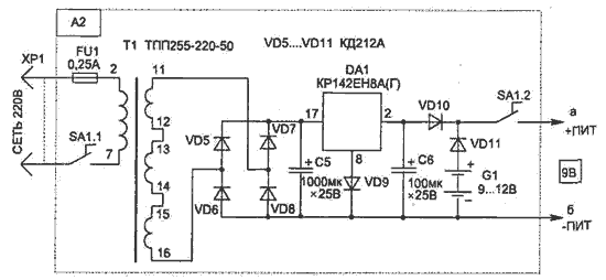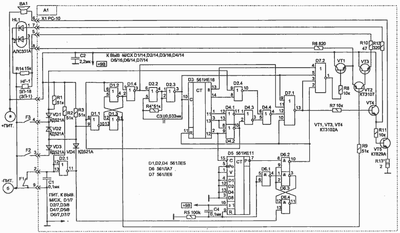 В стационарных условиях лучше, если устройство будет иметь смешанное питание — от сети и аккумулятора. При этом, основным является сетевой источник, а в аварийной ситуации (при отключении сети) автоматически подается резервное питание от аккумулятора (см. рисунок выше). В качестве датчиков F1...F3 для сигнализации удобно использовать герконовые контакты, например КЭМ-1, совместно с магнитом. Они малогабаритны и имеют высокую надежность. Чаще всего бывает достаточно всего одного датчика (F1) на входной двери. В случае кратковременного срабатывания датчиков схема из режима ОПОВЕЩЕНИЕ автоматически возвращается в режим ОХРАНА. Длительность звучания сигнала оповещения зависит от того, какой датчик сработал, и по звуку можно легко определить группу сработавших датчиков. Применяемые резисторы, конденсаторы и пьезоизлучатель (HF1) по дойдут любого типа, малогабаритные. Вместо транзисторов КТ3102 можно применить КТ315Г(Е), КТ3107 заменяется на КТ361Г(Е). Транзистор VT5 и стабилизатор DA1 крепятся на теплорассеивающих пластинах. В качестве диодов VD1...VD4 подойдут любые импульсные, VD5... VD11 заменяются на КД213А или аналогичные. Для сетевого блока питания трансформатор Т1 можно использовать с напряжением во вторичной обмотке 12...16 В и мощностью не менее 15 Вт. Так, например, подойдут унифицированные трансформаторы типа: ТПП266- 220-50, ТПП276-220-50, ТПП286-220-50. В этом случае, при монтаже, сохраняется нумерация выводов, указанная на схеме. Блок охраны размещается в скрытом месте, а соединения с датчиками лучше выполнять перевитыми между собой проводами, что исключит влияние внешних наводимых помех. При правильной сборке и исправных деталях схема начинает работать сразу и настройки, как правило, не требует. При необходимости временные интервалы 6 и 12 секунд можно одновременно изменить подбором номинала резистора R4. Резистор R13 позволяет ограничить мощность звука в динамике.