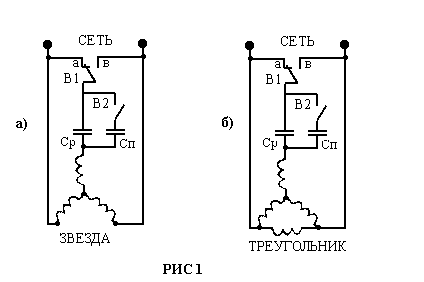 При переключении переключателя В1 (Рис. 1) двигатель меняет направление вращения. Двигатели с конденсаторным пуском имеютособенности. При работе электродвигателя вхолостую по обмотке, питаемой через конденсатор, протекает ток на 20—40% больше номинального. Поэтому при работе двигателя с недогрузкой нужно уменьшить рабочую емкость. При перегрузке двигатель может остановиться, тогда для его запуска необходимо снова включить пусковой конденсатор. Необходимо знать, что при таком включении мощность, развиваемая электродвигателем, составляет 50% от номинального значения.