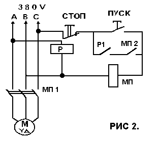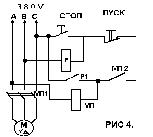 Первый способ (рис. 2). В обычную систему запуска трехфазного двигателя введено дополнительное реле Р с нормально разомкнутыми контактами Р1. При наличии напряжения в трехфазной сети обмотка дополнительного реле Р постоянно находится под напряжением и контакты Р1 замкнуты. При нажатии кнопки "Пуск" через обмотку электромагнита магнитного пускателя МП проходит ток и системой контактов МП1 электродвигатель подключается к трехфазной сети. При случайном отключении от сети провода А реле Р будет обесточено, контакты Р1 разомкнутся, отключив от сети обмотку магнитного пускателя, который системой контактов МП1 отключит двигатель от сети. При отключении от сети проводов В и С обесточивается непосредственно обмотка магнитного пускателя. В качестве дополнительного реле Р используется реле переменного тока типа МКУ-48.