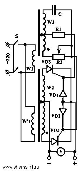ток до 50 А. W1, W2, W3 - обмотки трансформатора. V -