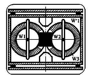 "Думаю, вас заинтересует переносной сварочный аппарат весом всего в 26 кг. Питающее напряжение промышленных сварочных аппаратов 380 В, что не всегда удобно и всегда небезопасно. Главную тяжесть сварочного аппарата составляет трансформатор с Ш-образным сердечником. У лабораторного автотрансформатора /ЛАТР/ сердечник круглый, в виде бублика. Взял два сердечника от ЛАТРов, с внутренней стороны каждого отмотал часть стальной ленты, образующей сердечник, так, что дырка бублика стала больше, и разместил первичную обмотку трансорматора /WI/, как показано на рисунке. Чтобы площадь сечения сердечника не изменилась, перед установкой обмотки снятую часть стальной ленты намотал на внешнюю сторону сердечника-бублика. Провод для первичной и вторичной обмоток я подобрал из расчета, что ток сварки - 80 А, то есть можно варить трехмиллиметровым электродом. Так я получил компактный и довольно легкий сварочный трансформатор.