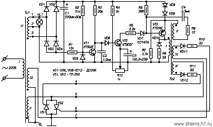 Принципиальная электрическая схема трансформатора приведена на рис. 1. Как следует из схемы, данное устройство - это разновидность трансформатора с тиристорным управлением, получившего распространение в последнее время. Для изготовления трансформатора и регулятора тока используют доступные материалы и детали.