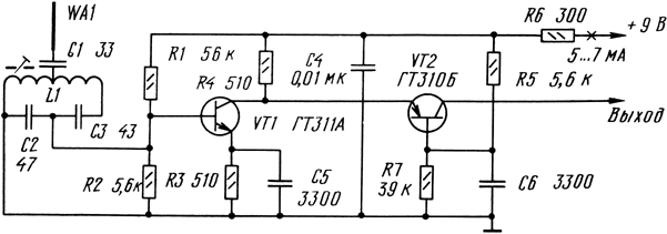 Чувствительность приемника "Ирень-401" можно существенно повысить, подключив к его антенному входу простую усилительную приставку (см. рисунок). Вместо штыревой антенны WA1 можно воспользоваться куском медного провода в изоляции длиной 30...40 см. Транзистор ГТ310Б можно заменить ГТ308 с индексами А, Б, В. Катушка L1 содержит 5 витков провода ПЭЛ 0,5 отвод от второго витка (справа по схеме). Ее обмотку намотать на каркасе с подстроечником катушек входных и гетеродинных контуров KB диапазона любого транзисторного приемника.