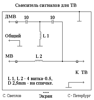Современные телевизоры имеют совмещенное гнездо “МВ” и “ДМВ” сигналов, но бывает так, что иногда надо их независимое вхождение. Данная схема предназначена для смешивания сигналов диапазонов ТВ. Катушки L1 и L2 имеют по 4 витка проводом диаметра 0.5-1мм, на каркасе 2.5-3мм или, проще говоря, на спичке. Схема собирается на небольшом отрезке гетинакса или стеклотекстолита, и помещается в экран соединенный с общим проводом. В качестве экрана можно использовать корпус от батареи типа “Корунд”. Все выходные соединения для антенн и ТВ, делаются отрезками телевизионного кабеля подходящего диаметра.