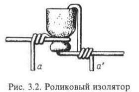 Разрезным же он назван в связи с тем, что вибратор разрезан на два плеча пополам. Плечи вибратора выполняют из провода. Можно использовать голый или изолированный провод, одножильный или многожильный, а также антенный канатик. Плечи вибратора изолированы одно от другого в середине орешковым изолятором 1. Такие же изоляторы установлены на концах вибратора, при помощи которых антенна двумя проводами или кусками шпагата крепится к стенам комнаты. В отсутствие орешковых изоляторов можно использовать обычные фарфоровые ролики, как показано на рис. 3.2. Выводы а-а' делают только у среднего изолятора, по краям их делать нет необходимости. Все четыре скрутки нужно тщательно пропаять, чтобы при натяжении антенны они не разошлись. Поэтому, если антенна выполнена из изолированного провода, его концы на соответствующую длину нужно освободить от изоляции.