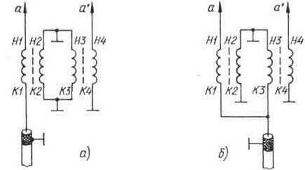 Использование U-колена при изготовлении комнатной антенны часто оказывается неудобным из-за его значительной длины, особенно на первых пяти каналах. Поэтому можно предложить более компактное симметрирующее устройство, показанное на рис. 3. 4. Оно представляет собой кольцо из феррита марки 50ВЧ или 1000НН размерами 7х4х2 мм, либо марки 100ВЧ размерами 8, 4х3, 5х2 мм. Кольцо сначала обматывают узкой полоской полиэтилена, а затем на него наматывают две обмотки, каждая из которых содержит восемь витков, намотанных двумя проводами ПЭЛШО диаметром 0, 21 мм. Витки обмоток необходимо распределить равномерно по кольцу, а их концы закрепить нитками. Важно соблюдать такое же направление витков, как показано на рисунке. Подключают фидер к антенне с помощью этого симметрирующего устройства в точках а-а' в соответствии со схемой, показанной на рис. 3. 5, а. Оплетка кабеля и заземленные концы обмоток соединяют в одной точке возможно более короткими проводниками.
