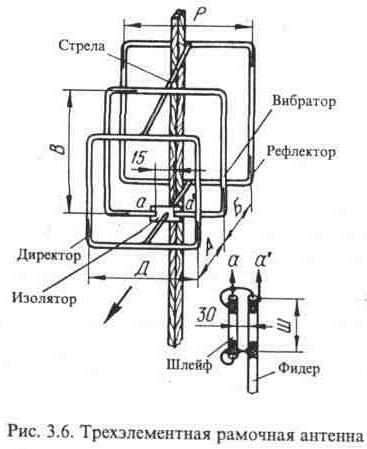 Одной из таких антенн, сравнительно несложной по конструкции, является трехэлементная рамочная антенна "Тройной квадрат", показанная на. рис. 3. 6. Коэффициент усиления этой антенны достигает 14 дБ, что соответствует увеличению напряжения сигнала на ее выходе в 5 раз по сравнению с полуволновым вибратором. Антенна содержит три квадратные рамки, из которых директорная и рефлекторная являются замкнутыми, а вибраторная в точках а-а' (точки питания) разомкнута. Рамки расположены симметрично, так, что их центры находятся на горизонтальной прямой, совпадающей с направлением на телецентр. Рамки выполняют из медного или латунного провода диаметром 3... 5 мм, который при размерах антенны дециметрового диапазона обладает достаточной жесткостью. Размеры антенны приведены в табл. 3. 2.