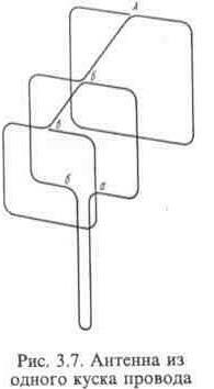 Радиолюбитель А. Нанаков из Чебоксар предложил конструкцию трехэлементной рамочной антенны дециметрового диапазона из одного целого куска толстого провода, изгибая его в соответствии с рис. 3. 7. В точках Л, Б и В провода необходимо спаять. В этой конструкции вместо шлейфа, выполненного из куска коаксиального кабеля, используется четвертьволновый короткозамкнутый мостик той же длины, что и шлейф. Расстояние между проводами мостика также остается прежним, равным 30 мм. Конструкция такой антенны оказывается достаточно жесткой, и необходимость в нижней стреле отпадает. Фидер подвязывают к правому проводу мостика с наружной стороны. При подходе фидера к вибраторной рамке оплетка кабеля припаивается к точке а, центральная жила - к точке б. Левый провод мостика закрепляется на стойке или в случае наружной антенны - на мачте. Необходимо лишь обратить внимание на то, чтобы в пространстве между проводами мостика не располагались ни фидер, ни стойка или мачта. Автор этой конструкции сообщает, что такая антенна использовалась им в качестве наружной. Она была установлена на крыше 10-этажного дома, а сигнал подавался по фидеру в квартиру, расположенную на втором этаже. Антенна показала наилучшие результаты по сравнению с другими антеннами.