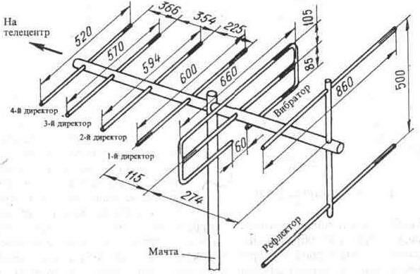 Рассмотрим еще одну антенну промышленного изготовления, которая была разработана до введения ГОСТ 11289-80, поэтому ее обозначение отличается от установленного этим стандартом, - АТВК-7/6-12 (антенна телевизионная "Волновой канал" семиэлементная, рассчитанная на прием передач в диапазоне 6-12-го каналов). Внешний вид антенны и ее размеры показаны на рис. 4. 13.