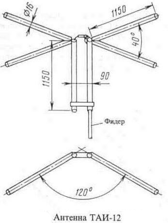 Простота конструкции антенны ТАИ-12 допускает ее изготовление самостоятельно. Трубки веерного вибратора и мостика с наружным диаметром в пределах от 15 до 20 мм могут быть из любого металла, но предпочтительнее использовать медь или латунь, которые легче подвергаются пайке. Антенна устанавливается на деревянной или металлической мачте и крепится к ней за правую трубку мостика хомутиками. При этом мачта не должна находиться между трубками мостика. Самодельную антенну можно выполнить без трансформатора: 75-омный кабель фидера пропускается внутри правой трубки мостика доверху, где оплетка кабеля припаивается к правой трубке мостика, а центральная жила - к левой.