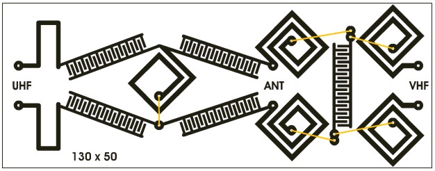 Известно, что симметричный спуск имеет меньшие потери, чем коаксиальный кабель, особенно после нескольких лет эксплуатации. Довольно неожиданный положительный эффект дает применение телефонной лапши для внутренней телефонной проводки, которая имеет волновое сопротивление около 300 Ом. Еще лучший результат дает применение телефонного кабеля для наружной проводки - лучше изоляция, диаметр провода больше. Предлагаемая печатная плата содержит все пассивные элементы для реализации смесителя непосредственно возле антенн. После изготовления печатную плату не лудить, так как сопротивление олова в 4 раза выше сопротивления меди, а высокочастотные токи, как известно, распространяются по поверхности. На плате, со стороны, где нет фольги, необходимо добавить еще 5 перемычек в местах, показанных на рисунке темно-желтым цветом. Плату необходимо поместить в герметичную коробку, в качестве которой может быть использована полиэтиленовая бутылка.