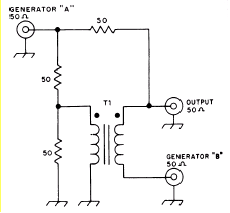 При измерении многих электрических параметров радиоприемников необходимо одновременно подавать ВЧ сигналы от двух генераторов (ГСС). Для этой цели используются сумматоры. Представленная ниже схема сумматора обеспечивает затухание между входами GENERATOR-A и GENERATOR-B около 40...50 дБ.
