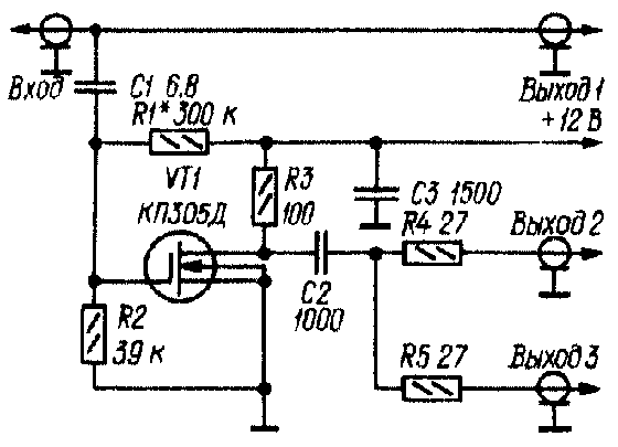 Если необходимо подключить к фидеру телевизионной антенны два-три телевизора, целесообразно использовать активный ответвитель на полевом транзисторе (см. рис.1). Он практически не вносит рассогласования в фидер и в то же время обеспечивает выходной сигнал, достаточный для нормальной работы телевизора.