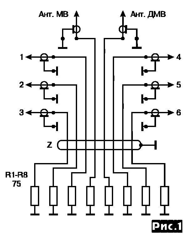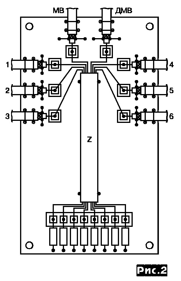 Затем вставляют жгутик в трубчатый экран Z, припаивают его корпус к плате и распаивают нижние по схеме концы проводов к «пятачкам» с резисторами, а верхние - к «пятачкам» подключения кабелей. Прозванивать провода не требуется. Трубчатый экран Z изготовлен из луженой жести или из латунной фольги, имеет диаметр 5-8 мм и длину 50 мм. Все кабели, подсоединенные к устройству, имеют волновое сопротивление 75 Ом. Их концы укреплены на плате капроновыми нитками, продетыми в отверстия диаметром 1-2 мм. После завершения монтажа и укладки проводников плату покрывают лаком.