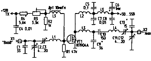 Идея использовать полевой транзистор КП904А в усилителе мощности диапазона 2 м возникла поневоле - во время работы в "тропо" вышел из строя транзистор КТ931А, а заменить его было нечем. Тогда выбор пал на КП904А (по справочным данным он работоспособен до частоты 400 МГц). Усилитель на этом транзисторе некритичен к качеству источника питания (в моем случае он питается нестабилизированным напряжением +55 В при емкости выходного конденсатора источника питания 10000 мкФ), не требует принятия специальных мер для стабилизации тока покоя транзистора и имеет очень простую схему (рис.1). При входной мощности 4...5 Вт выходная мощность составляет 20...25 Вт на нагрузке 75 Ом.