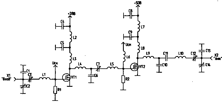 Для получения большей выходной мощности (около 40 Вт) можно последовательно включить два аналогичных каскада, запитав предоконечный каскад напряжением +28 В, а оконечный - +50 В (рис.2).