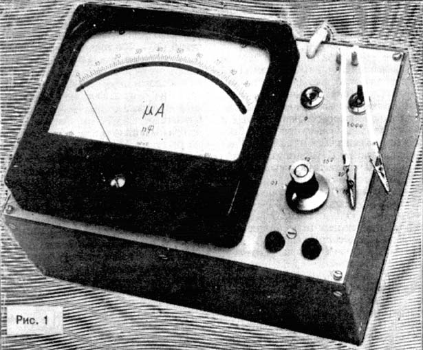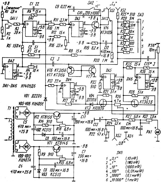 С выхода интегратора сигнал подают на усилитель тока, выполненный на транзисторе VT4 по схеме эмиттерного повторителя, для получения требуемых значений токов при измерении больших значений емкостей конденсаторов. После эмиттерного повторителя сигнал треугольной формы поступает на одну из обкладок измеряемого конденсатора Cx, подключенного к гнездам XS1 и XS2. После прохождения через конденсатор форма колебаний из треугольной преобразуется в трапецеидальную, длительность фронта, спада и амплитуда которых зависят от величины измеряемой емкости конденсатора. Трапецеидальный сигнал через резистор R25 подают на вход дефференциатоpa на микросхеме DA5. Ее вход защищен от короткого замыкания выводов подключения измеряемого конденсатора (подключение конденсатора с пробоем или случайное соприкосновение выводов) последовательно включенными эмиттерными переходами транзисторов VT6 и VT7. На выходе микросхемы DA5 формируется сигнал, по амплитуде пропорциональный величине измеряемой емкости. Парафаэный сигнал для работы синхронного детектора формируется работой дифференциатора и инвертора на микросхеме DA6. Синхронный детектор выполнен на полевых транзисторах VT3 и VT5. Его работу синхронизируют сигналом каскада формирователя прямоугольных колебаний, подаваемым на одно плечо через развязывающий диод VD1, а на другое - через инвертор на микросхеме DA4 и развязывающий диод VD4. Выход детектора (истоки транзисторов) подключен к балансировочному резистору R26, а с его движка сигнал через RC-фильтры R22R24C13 и R27R37C14 подают соответственно к цифровому или стрелочному (PA1) индикатору. Внешний цифровой индикатор (вольтметр с пределом измерения 100 мВ и входным сопротивлением 1 МОм) подключает через гнезда-разъемы XS3 и XS4 на передней панели измерителя емкости. В приборе предусмотрена возможность измерения и полярных конденсаторов, имеющих большую утечку, обратносмещенных P-N переходов транзисторов или диодов. Для этого к неинвертирующему входу микросхемы DA1 автогенератора подано постоянное напряжение смещения с делителя R1R2. В этом случае на выходе микросхемы DA3 интегратора образуется постоянная составляющая порядка 2 В. Такой режим работы соответствует верхнему (по схеме) положению переключателя SA1.1. Двуполярный блок питания состоит из трансформатора T1, двух выпрямителей и стабилизаторов с выходными напряжениями +9 и -9 В, выполненных по одинаковой схеме. В качестве опорных элементов образцового напряжения VD2 и VD3 применены стабилитроны с повышенной температурной и временной зависимостью. Выходное напряжение стабилизаторов можно изменять подстроечными резисторами R15 и R18. В конструкции прибора использованы постоянные резисторы С2-8 (R29 - R34) с мощностью рассеяния 0,25 Вт и допустимым отклонением от номинального значения ±1%, остальные МЛТ-0,25 (можно применить и с мощностью рассеяния 0,5 Вт), подстроечные - СП5-2. Резисторы R29 - R33 отобрать с указанным значением сопротивлений или выполнить составными из нескольких резисторов. Оксидные конденсаторы типа К50-6 или К50-16, остальные керамические - трубчатые КГ и монолитные КМ различных модификаций. Конденсаторы C9 (КМ-6) и C10 (КМ-4) следует подобрать с точностью не хуже ±1%. Переключатели SA1 - МТЗ (возможна замена на МТДЗ, ТП1-2), SA2 - MT1 (МТД1, ТВ2-1), SA3 - ПГ2-1-6П1H. В качестве стрелочного индикатора применен микроамперметр типа М1792 на 100 м