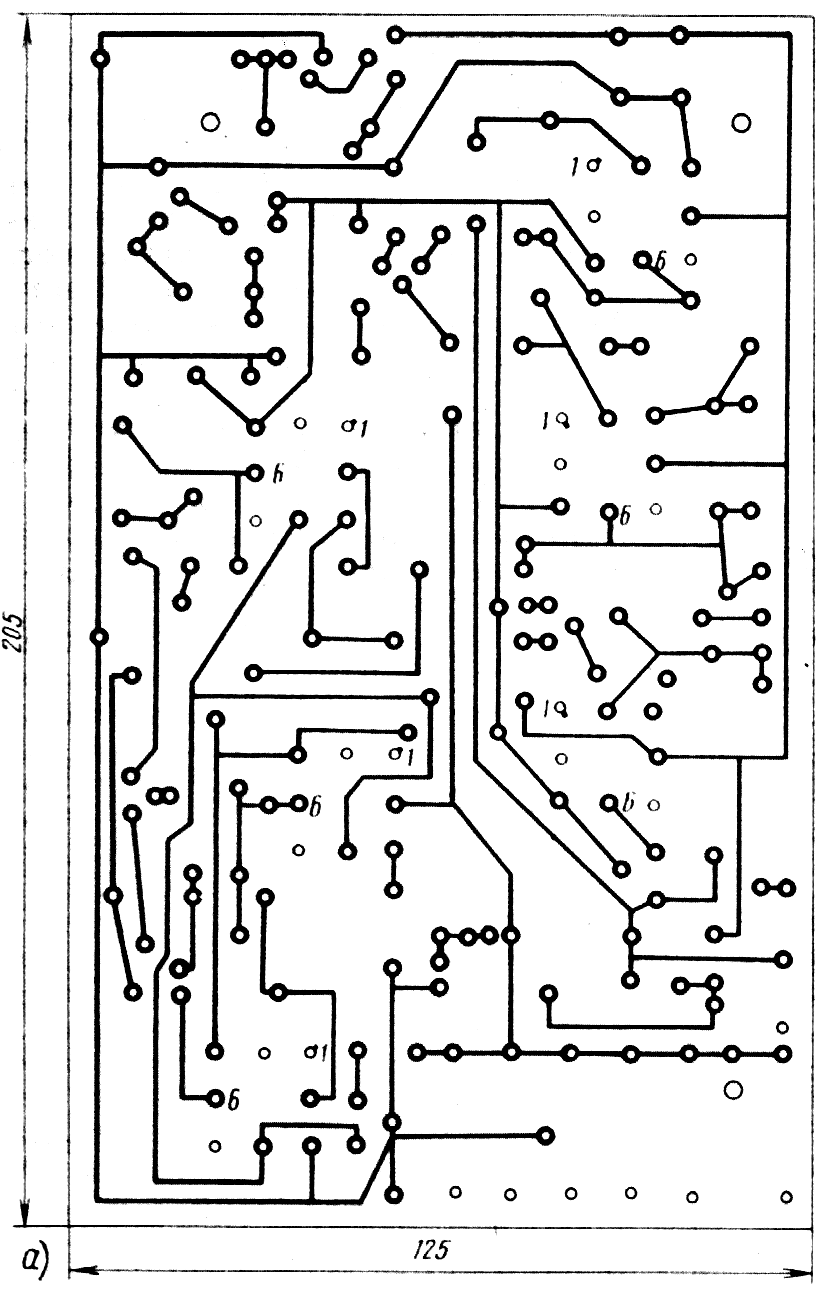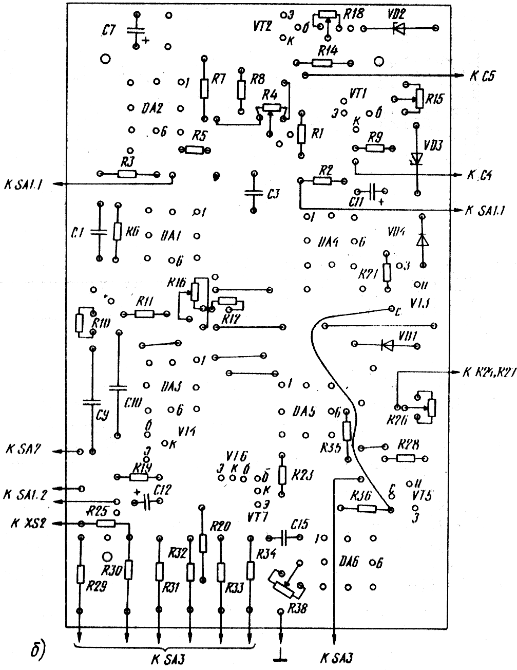 Рисунок печатной платы показан на рис.3а, расположения на ней элементов - на рис.3б. На плате блока питания расположены выпрямительные мосты и конденсаторы C4 и C5, монтаж этих элементов - соединительными проводниками. Регулировку прибора следует начать с тщательной проверки правильности монтажа, сборки и соединения узлов. Проверку работоспособности отдельных узлов и блоков лучше проводить при наличии вольтметра с внутренним сопротивлением не менее 10 кОм/В (можно использовать радиолюбительский авометр) и осциллографа, можно даже среднего класса, такого, например, как осциллографы группы ОМЛ. Проверку работы узлов измерителя емкости проводят при отключенном индикаторе PA1. Вначале необходимо измерить напряжения на выходах стабилизаторов питания и, в случае их отклонения от нормы (+9 и -9 В), произвести необходимую регулировку подстроечными резисторами R15 и R18. Затем проверить напряжение питания, подводимое к каждой микросхеме. После этого осциллографом проверяют форму колебаний на выходе микросхемы DA1. Для этого его вход подключить через защитный резистор (чтобы исключить случайное замыкание выхода микросхемы на общую шину) с сопротивлением 3...10 кОм к выводу 6 микросхемы. При правильной работе генератора на экране осциллографа должны быть прямоугольные импульсы с амплитудой порядка 8 В. Если колебания несимметричны относительно нуля, то регулировкой подстроечного резистора R16 произвести сдвиг в нужную сторону. Вход осциллографа переключить к эмиттеру транзистора VT4 и проверить работу интегратора. Колебания должны быть симметричной треугольной формы с хорошей линейностью, а их частота зависеть от положения переключателя SA2. В положении ‹х1› она должна быть 1000 Гц. а ‹› - 1 Гц, частоты определяются величинами конденсаторов C9, C10 и резисторами R10, R11. В процессе регулировки частоту интегратора устанавливают регулировкой подстроечного резистора R10. Искажения могут возникнуть при низком качестве микросхемы DA3 или при смещении сигнала от нулевого уровня. Регулировку каскадов на микросхемах DA5 и DA6 начинают с предела ‹1000› переключателя SA3 при множителе ‹› (SA2). Для этого осциллограф с защитным резистором подключают к выводу 6 микросхемы DA6, а параллельно входу осциллографа - вольтметр постоянного тока с пределом измерений 3...5 В. При нормальной работе каскадов вольтметр будет иметь незначительное отклонение, если клеммы Cx разомкнуты. При подключении конденсатора с емкостью 1000 пф на экрана осциллографа будут колебания трапецеидальной формы. Вольтметр с тем же пределом измерений переключить на выход синхронного детектора (параллельно резистору R26). Осциллографом поочередно проверить на затворах транзисторов VT3 и VT5 управляющее напряжение прямоугольной формы - оно должно быть амплитудой порядка 8 В и противофазным. Балансировку работы синхронного детектора производят резистором R26 при разомкнутых выводах подключения измеряемых конденсаторов установкой минимального напряжения по шкале вольтметра. При подключении измеряемого конденсатора емкостью 1000 пф вольтметр регистрирует напряжение порядка 1 В. Теперь подключают индикатор P1 и проверяют калибровку прибора в комплексе, начиная с выбора компенсации паразитной емкости прибора и наводки. Для этого резисторы R4 и R38 устанавливают в положения минимальных сопротивлений между д