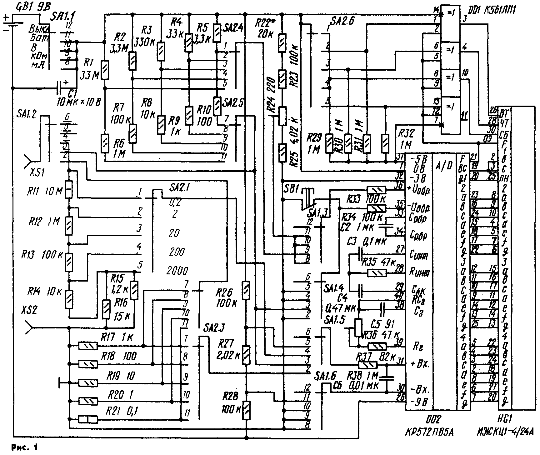 В радиолюбительской литературе описаны цифровые мультиметры с использованием микросхемы КР572ПВ2А [1, 2]. Как правило, это достаточно сложные устройства, что объясняется необходимостью использования двух источников питания, источника опорного напряжения, линейного преобразователя переменного напряжения в постоянное. Мультиметры требуют также мощного источника энергии в связи с необходимостью использования светодиодных индикаторов. Появление микросхемы КР572ПВ5А существенно упростило построение мультиметров. Эта микросхема выполняет те же функции, что и КР572ПВ2А, но специально приспособлена для работы с жидкокристаллическим индикатором. Для этой микросхемы необходим один источник питания с напряжением 7...10 В, она имеет внутренний стабилизатор опорного напряжения (такой стабилизатор есть и в КР572ПВ2А, но использовать его трудно) и стабилизатор напряжения 5 В для питания КМОП — цифровых микросхем. Ниже приведено описание простого цифрового мультиметра с микросхемой КР572ПВ5А, содержащий, кроме нее, лишь одну цифровую микросхему К561ЛП2, необходимую для управления запятыми индикатора. Упрощение устройства достигнуто также за счет отказа от измерения переменных напряжений и токов.