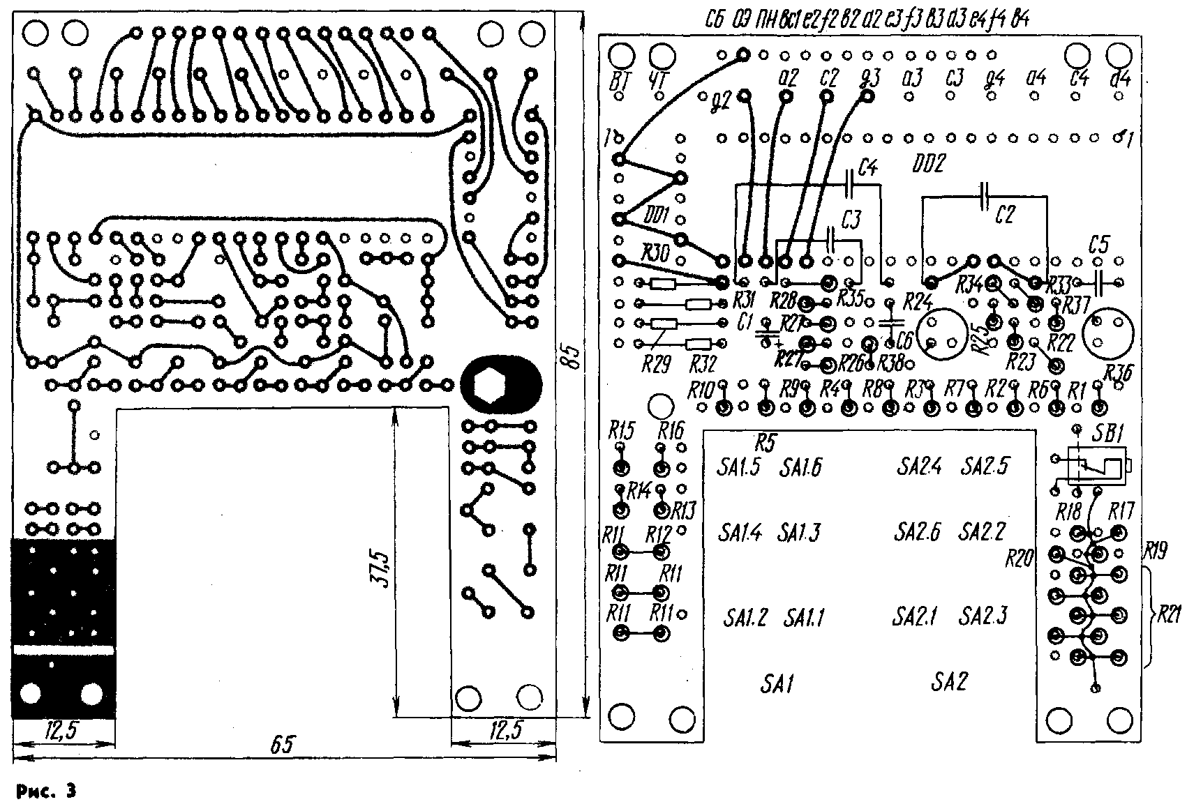 В мультиметре использован жидкокристаллический индикатор ИЖКЦ1-4/24А, используемый для работы в электронных часах. Этот индикатор не имеет запятых, в нем невозможна отдельная индикация сегмента g первого разряда для знака «минус», поэтому в качестве запятых используются сегменты дней недели «ВТ», «ЧТ», «СБ», что вполне приемлемо, а в качестве знака «минус» — сегмент «ПН». Более удобно было бы использование индикатора ИЖКЦ5-4/8. Элементы мультиметра, кроме переключателей и батареи питания, расположены на двух печатных платах из фольгированного стеклотекстолита. Размер обеих плат — 65х85 мм. Основная плата — двусторонняя. На рис. 3, а приведено расположение проводников и деталей, на рис. 3, б — проводников с другой стороны платы.