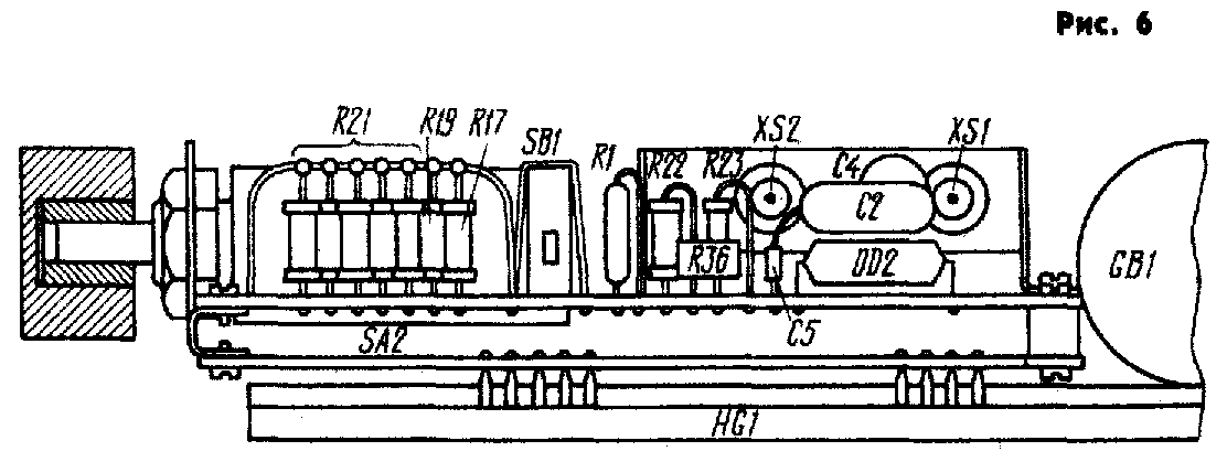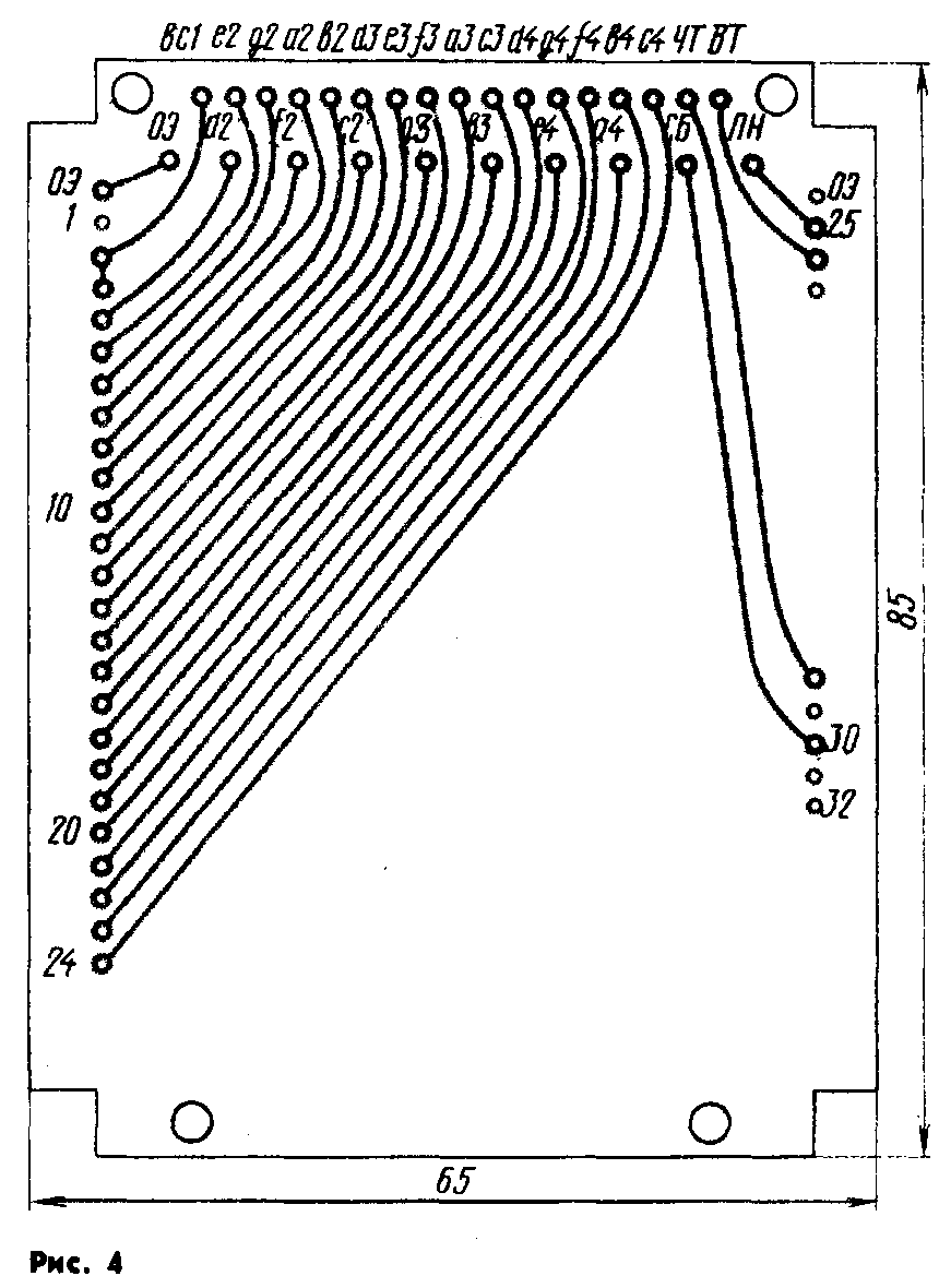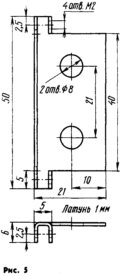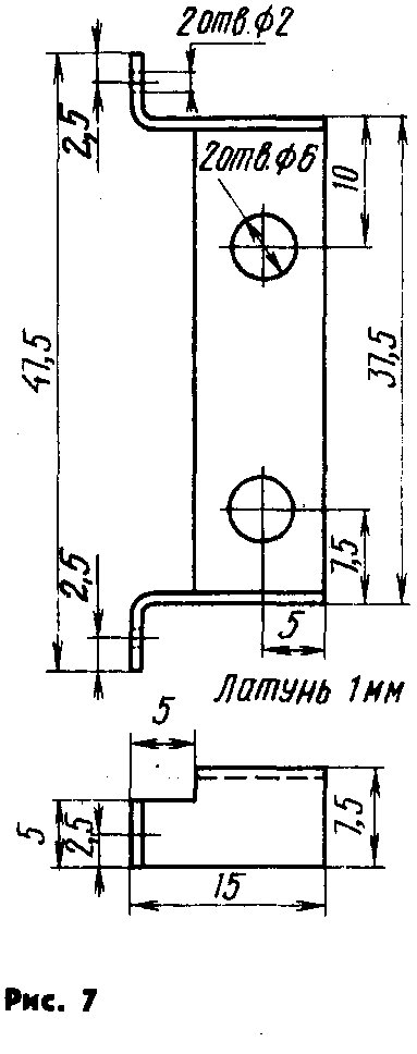 На рис. 4 показано расположение проводников на односторонней плате для подпайки индикатора. Переключатели установлены на кронштейне из латуни толщиной 1 мм (рис. 5). Этим же кронштейном скреплены между собой обе платы с одной стороны. С другой стороны они соединены между собой с помощью двух латунных резьбовых втулок диаметром 5 мм и такой же высотой (рис. 6). Входные гнезда установлены на небольшом кронштейне (рис. 7) над микросхемой DD1 и резисторами R29—R32. Конденсаторы С2—С4 расположены над микросхемой DD2. Переключатели снабжены двенадцатигранными ручкамибарабанами, изготовленными из алюминия. На грани одной ручки нанесена гравировка режимов измерения, другой — пределов измерения. От осей переключателей ручки изолированы диэлектрическими втулками. Платы мультиметра размещены в полистироловом корпусе с габаритными размерами 116х72х34 мм.