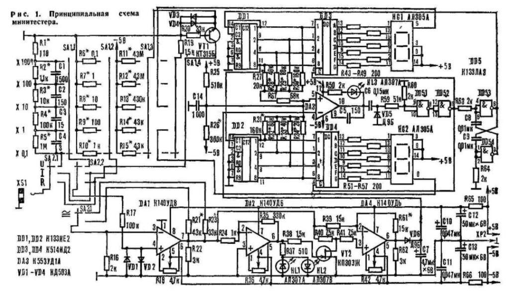 Все резисторы, кроме R6, R7. — МЛТ-0,125, R6, R7 — проволочные, провод ПЭВМ 0,4 или аналогичный высокоомный, R11 собран из четырех резисторов по 10 МОм. Подстроечные резисторы R18, R36, R42 — любые малогабаритные. Конденсаторы — керамические, например KM. C1—C4 должны быть подобраны с точностью не хуже 1 %, тоже касается и резисторов входного делителя. Электролитические конденсаторы: С7 — К53-1, С12, C13 — К50-6. Указанные на принципивяьной схеме полупроводниковые приборы и ИМС заменять на другие типы не рекомендуется. Исключение составляют лишь операционные усилители К140УД6, вместо которых можно использовать К140УД7. Гнездо XS1 — от микротелефона для транзисторных радиоприемников. Через разъем ХР2 минитестер соединяют с доработанным блоком питания «Электроника Д2-15» (рис. 6) или любым другим, имеющим стабилизированные напряжения +5 В (ток нагрузки 150 мА) и —5 В (ток нагрузки 15 мА). Настройка прибора доступна радиолюбителю средней квалификации. Вам потребуется осциллограф типа С1-70 или С1-101, универсальный вольтметр с точностью не хуже 0,5 %, например В7-16, звуковой генератор, батарея 3336Л. В крайнем случае можно использовать тестер класса 1,5, но точность настройки будет хуже. На отдельной макетной плате собирают входной делитель напряжения Rl — R5, С1 — С4 и подсоединяют к нему батарею 3336Л. С помощью вольтметра устанавливают напряжение таким образом, чтобы на каждом последующем резисторе (начиная с R5) оно уменьшалось в 10 раз. В противном случае устанавливают соответствующий резистор меньшего номинала и подчищают его проводящий слой микронной шлифовальной шкуркой, причем доводку выполняют обычной ученической резинкой. После подгонки сопротивлений резисторов их промывают, не касаясь проводящего слоя, в ацетоне и покрывают лаком методом окунания. Далее на вход делителя подают сигнал частотой не ниже 20 кГц со звукового генератора и подбирают емкости конденсаторов С1 — С4. Затем собирают делитель тока и, подключив к нему батарею на 4,5 В и добавочный переменный резистор, устанавливают величины токов, протекающих через резисторы R6, R7, R8, R9, R10, соответственно рваные 1000, 100, 10, 1, 0,1 мА. Причем падение напряжения на каждом отдельном резисторе должно составлять 100 мА. Точные их значения подгоняют описанным выше способом, кроме R6 и R7, у которых подбирают длину провода. И наконец монтируют измеритель сопротивлений. Ко входу устройства поочередно подсоединяют резисторы сопротивлением 1000, 100, 10, 1, 0,1 кОм и, подбирая величины R11 — R15, добиваются, чтобы через измеряемые резисторы протекали соответственно токи силой 0,1, 1, 10, 100, 1000 мкА. После этого элементы всех делителей впаивают в монтажную плату прибора. В петли платы П4 устанавливают платы П1, П3 и закрепляют их штифтами диам. 1 мм. Вывод 4 DA3 (рис. 1) заземляют через резистор сопротивлением 47 кОм, элемент R67 шунтируют перемычкой, вместо резисторов R27 — R30 впаивают цепочки, состоящие из постоянного и переменного резисторов: R27 (18+4,7) кОм, R28 (36+8,2) кОм, R29 (75+10) кОм, R30 (150+22) кОм, установив их значения в соответствии с принципиальной схемой. К выводу 5 DA3 подсоединяют осциллограф, к выводу 4 — вольтметр и включают питание ± 5 В. Помните, что при монтаже и настройке паяльник и измерительные приборы должны быть заземлены через общий резистор сопротивлением 1 МОм, иначе статический разряд выведет из строя микросхемы. Все пайки выполняют при отключенном источн