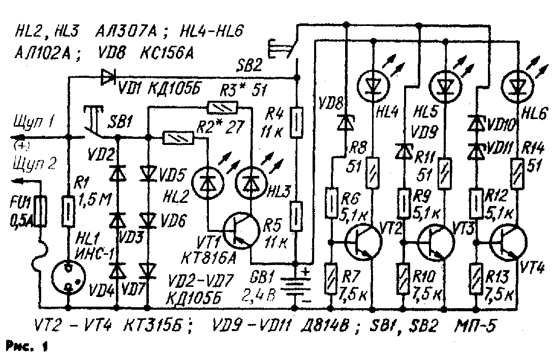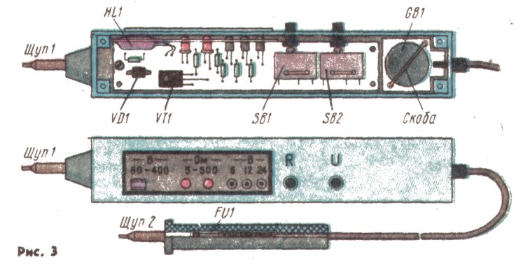 Принципиальная схема прибора показана на рис. 1. При всех видах испытаний его подключают к проверяемой цепи щупом 1, смонтированным на корпусе прибора, и щупом 2, соединенным с прибором гибким многожильным проводом. Показанное на схеме положение кнопок S81 и SВ2 соответствует режиму индикации напряжения 60...400 В. В этом же режиме цепь VD1, R4, R5 позволяет заряжать аккумуляторную батарею GB1. При нажатии на кнопку S82 прибор работает в режиме индикации фиксированных значений напряжения. Если включился саетодиод НL4 в испытуемой цепи напряжение не менее 6, но не более 12 В, если светят сразу НL4 и НL5 — то в пределах от 12 до 24 В, в если все три светодиода НL4, НL5, НL6 — более 24 В. При измерении напряжения постоянного тока щуп 1 подключают к плюсовому проводу проверяемой цепи. При нажатии на кнопку SВ1 (S82 отпущена) прибор работает в режиме индикации сопротивления. Готовность прибора к работе проверяют одновременным нажатием на кнопку SВ1 и замыканием щупов. При этом свечение светодиодов НL2 и НL3 одинаково и максимально, что соответствует нулевому измеряемому сопротивлению. Сопротивление в интервале 5...50 Ом индицирует светодиод НL2, меняя яркость свечения в обратной пропорциональности; при этом яркость светодиода НL3 остается неизменной и максимальной. Если между щупами включено сопротивление более 50 Ом, светодиод НL2 не светит, а светодиод НL3 уменьшает яркость свечения с увеличением сопротивления. Это дает возможность при определенном навыке определять значение сопротивления с точностью, достаточной для практики. В этом же режиме определяют целостность р-п-переходов диодов, транзисторов и т. п. Исправность конденсаторов значительной емкости определяют по интенсивности вспышки светодиода НL3 в момент касания щупами выводов конденсатора. Прибор защищен от ошибочного подключения под напряжение 220 В в режиме измерения сопротивления или фиксированных значений низкого напряжения. Узел на транзисторах VТ2—VТ4 в течение времени, необходимого для измерения, такое аварийное подключение выдерживает, а узел на транзисторе VT1 защищают диоды VD2—VD7 и предохранитель FU1.