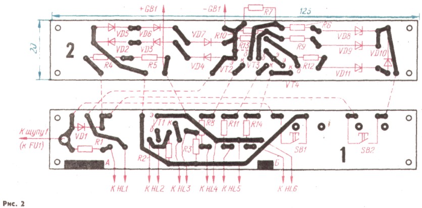 Все детали пробнике, за исключением батареи питания GB1 и предохранителя FU1, смонтированы на двух печатных платах из фольгированного стеклотекстолита толщиной 1 мм. Чертежи обеих плат показаны на рис. 2. Здесь же показаны все перемычки и межплатные соединения. Обе платы скрепляют между собой четырьмя винтами М2,5, при этом платы должны быть расположены печатными проводниками внутрь. Между платами необходимо уложить изолирующую прокладку из стеклотекстолита (без фольги) толщиной 1 мм, размеры прокладки равны размерам плат. К торцу платы, не которой размещены светодиоды, пaйкой к фольговым площадкам, обозначенным буквами А и Б, крепят фальшпенель из фольгмрованного стеклотекстолите толщиной 1 мм. В фальшпанели сверлит отверстия под светодиоды и окно под неоновую лампу. Необходимые надписи можно нанести на фальшпанель травлением фольги или краской. Микровыключатели МП-5 закрепляют скобами из медной проволоки толщиной 1 мм, впаянными в плату к специально предусмотренным для этого площадкам. Предохранитель вмонтирован в щуп 2.