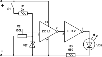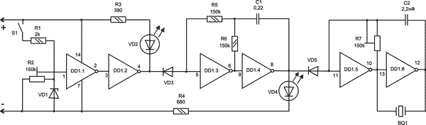 Индикатор работает следующим образом. В исходном состоянии кнопка S1 разомкнута и на входе инвертора DD1.1 присутствует логический «0». Соответственно логический «0» присутствует и на выходе инвертора DD1.2. При этом диод VD3 шунтирует вход инвертора DD1.3 на «землю» и таким образом стопорит манипулятор, на выходе которого также оказывается логический «0», благодаря чему через диод VD5 на «землю» шунтируется и вход инвертора DD1.5 и мультивибратор находится в ждущем режиме. В результате светодиоды VD2 и VD4 не горят и звуковой сигнал отсутствует.