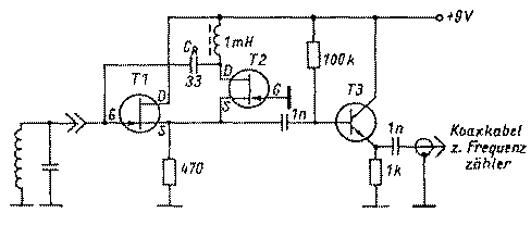 Приведенная схема устойчиво работает в диапазоне 1...30 МГц. Важными являются величины индуктивности в цепи стока Т2 и конденсатора Сг в цепи обратной связи. Уменьшением индуктивности можно обеспечить измерение в 2-метровом диапазоне. Правда, при этом сильно возрастает нижняя граничная частота измерений. Для того, чтобы измерять и на KB, и на УКВ, можно ввести несколько переключаемых индуктивностей. При определении истинной частоты резонанса на УКВ необходимо учитывать также входную емкость схемы.