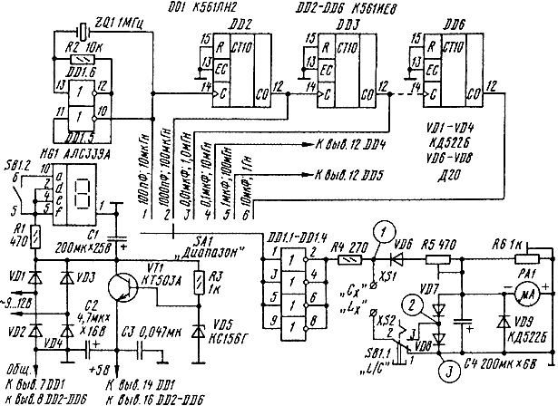 Принцип работы прибора основан на измерении среднего значения разрядного тока емкости конденсатора и ЭДС самоиндукции индуктивности. Измеритель, принципиальная схема которого приведена на рис.1, состоит из задающего генератора на элементах DD1.5, DD1.6 с кварцевой стабилизацией частоты, линейки делителей частоты на микросхемах DD2 - DD6 и буферных инверторов DD1.1 - DD1.4. Резистор R4 ограничивает выходной ток инверторов. Цепь из элементов VD7, VD8, R6, C4 используется при измерении емкости, а цепь VD6, R5, R6, C4 - при измерении индуктивности. Диод VD9 защищает микроамперметр PA1 от перегрузки. Емкость конденсатора C4 выбрана сравнительно большой, чтобы уменьшить дрожание стрелки на максимальном пределе измерения, где тактовая частота минимальна - 10 Гц.