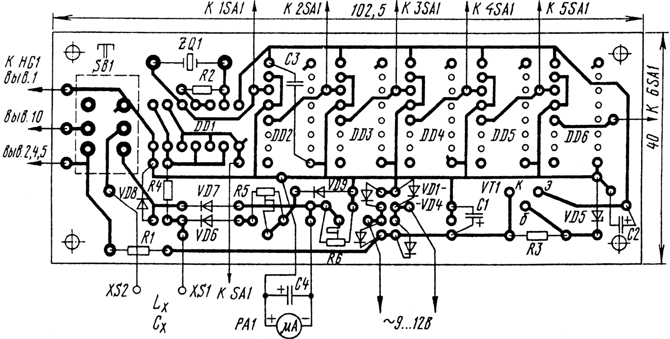 Рисунок печатной платы, выполненной на фольгированном стеклотекстолите толщиной 1,5 мм, приведен на рис.2. Настройку прибора начинают в режиме измерения емкости. Переводят переключатель SB1 в верхнее по схеме положение и устанавливают переключатель диапазона SA1 в положение, соответствующее пределу измерения 1000 пФ. Подключив образцовый конденсатор емкостью 1000 пФ к клеммам XS1, XS2, движок подстроечного резистора R6 выводят в положение, при котором стрелка микроамперметра PA1 установится на конечное деление шкалы. Затем переводят переключатель SB1 в режим измерения индуктивности и, подключив к клеммам катушку индуктивности величиной 100 мкГн, в том же положении переключателя SA1 производят аналогичную калибровку подстроечным резистором R5. Естественно, точность калибровки прибора определяется точностью используемых образцовых элементов. Измерения прибором параметров элементов желательно начинать с большего предела измерений для избежания резкого зашкаливания стрелки головки прибора. Для обеспечения питания измерителя можно использовать постоянное напряжение 10...15 В или переменное напряжение от подходящей обмотки трансформатора питания другого прибора с током нагрузки не менее 40...50 мА. Мощность отдельного трансформатора должна быть не менее 1 Вт. В случае питания прибора от батареи аккумуляторов или гальванических элементов напряжением 9 В его можно упростить и повысить экономичность исключением диодов выпрямителя напряжения питания, индикатора HG1 и переключателя SB1, выведя на переднюю панель прибора три клеммы (гнезда) от точек 1, 2, 3, указанных на принципиальной схеме. При измерении емкости конденсатор подключают к клеммам 1 и 2, при измерении индуктивности катушку подключают к клеммам 1 и 3. Примечание редакции. Точность измерителя LC со стрелочным индикатором в определенной степени зависит от участка шкалы, поэтому введение в схему переключаемого делителя частоты на 2, 4 или аналогичное изменение частоты задающего генератора (для варианта без кварцевого резонатора) позволяет снизить требования к габаритам и классу точности показывающего прибора.