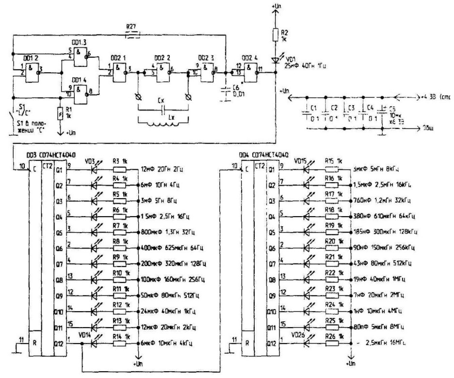 Технические характеристики прибора: диапазон измеряемой емкости (мкФ) от 80 х 10-6 до 25 х 10 3; диапазон измеряемой индуктивности (Гн) от 2,5 х 10-6 до 40; диапазон измеряемых частот (Гн) от 1 до 16 х 10 6. Схема измерителя показана на рисунке. На элементах DD1 и DD2 собран генератор, времязадающим элементом которого являеться измеряемая емкость или индуктивность. На элементах DD3 и DD4 собран делитель частоты с коэффициентом деления 16777211. Вся шкала прибора включает 25 значений, отличающихся друг от друга в 2 раза. При работе прибора визуально определяют, частота мигания какого светодиода ближе всего к 1 Гц. Показания напротив него и являются результатом измерения.