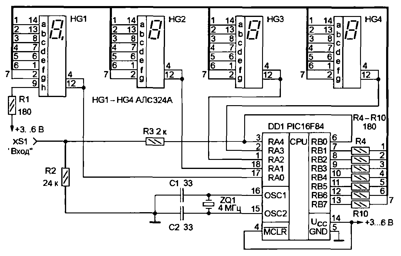 Этот прибор предназначен для измерения частоты логических сигналов, а также периодических сигналов непрямоугольной формы положительной полярности. Он предельно прост по схеме и в работе (пределы измерений переключаются автоматически) и может найти применение в тех случаях, когда отсчета частоты с точностью до третьего знака достаточно. Частотомер, принципиальная схема которого изображена на рисунке, позволяет измерять частоту периодических сигналов в диапазоне 250 Гц...50 МГц. Погрешности измерений и отсчета для каждого интервала частот приведены в табл. 1. Входное сопротивление прибора - не менее 2 кОм. Уровень лог. О входного напряжения должен быть не более 0,2, а лог. 1 - не менее 0,8ип„, , где ипит - напряжение питания, которое может быть любым в пределах 3...6 В. Потребляемый ток не превышает 100 мА. Как видно из схемы, основной элемент частотомера - микроконтроллер PIC16F84, осуществляющий счет импульсов внешнего сигнала, поступающего на вход прибора, обработку полученных значений и вывод результатов измерения на табло.