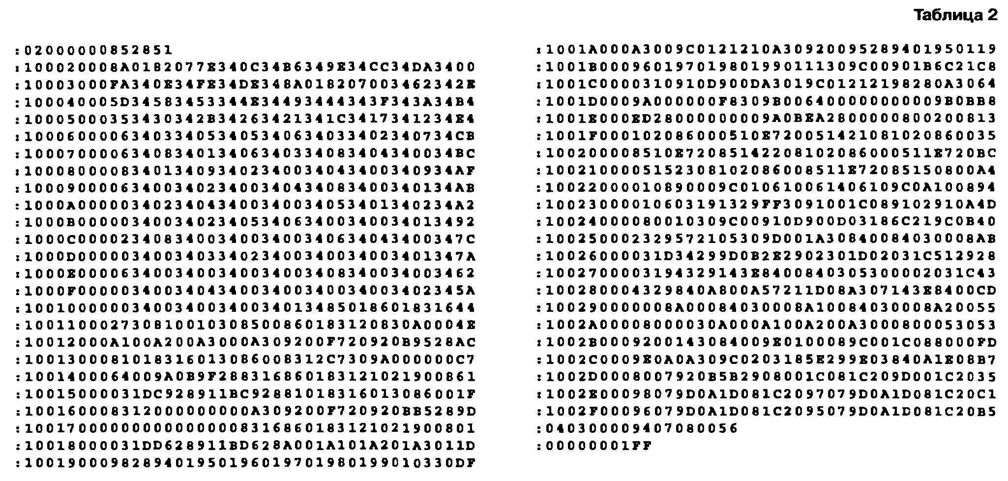 Коды "прошивки" ПЗУ микроконтроллера в формате MicroChip.hex приведены в табл. 2. Исходный текст программы желающие найдут на ftp-сервере редакции в Интернете (ftp://ftp.paguo.ru/pub/ или ftp://212.188.13.179/pub/). Частотомер можно значительно удешевить, если выполнить его на базе PIC-контроллера с однократно программируемым ПЗУ, например, PIC16C54C, стоимость которого вдвое меньше (при этом потребуется незначительная доработка программы). Применение ЖК индикатора с устройством управления, например, НТ1621, позволит снизить потребляемый ток примерно до 5 мА.