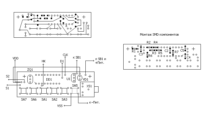 Настройка и управление. После установки всех деталей кроме ЖКИ и контроллера на плату необходимо проверить наличие +5 В на выходе стабилизатора и +1,5 В на аноде светодиода VD1. При наличии этих напряжений подпаять ЖКИ и подать питание, при этом индикатор должен включится в режиме часов. Далее вставить в панельку контроллер, и при возможности проконтролировать работу кварцевого генератора; на ножке 15 DD1 должны присутствовать импульсы частотой равной частоте кварца.