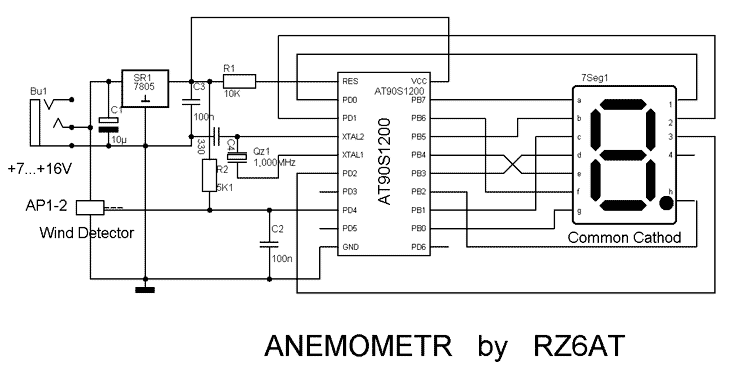 Конструкция выполнена с использованием датчика скорости ветра типа АП1-2, микроконтроллера AT90S1200 и 3-х разрядного светодиодного семисегментного индикатора.