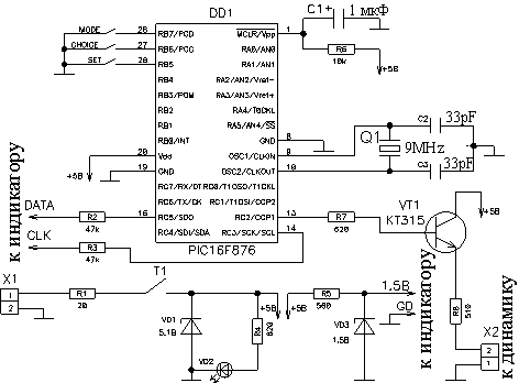 Часы основаны на микроконтроллере PIC16F876. В качестве индикатора используется 10-разрядный жк-индикатор с контроллером HT1611. Питание данного индикатора подается на вторую слева (GND) и на крайнюю правую клеммы (+1,5В). Вывод HK (пятая клемма) следует соединить с общим проводом. (Более подробную информацию о данном индикаторе, а также и заказать его, вы можете на сайте фирмы "Телесистемы" - www.telesys.ru.) Питание на индикатор можно подать так, как показано на схеме, т.е. с помощью стабилитрона из 5В получить 1.5В. Однако, такой стабилитрон оказался достаточной редкостью, поэтому вместо него вполне подойдет светодиод (прямое включение, разумеется). Частота кварцевого резонатора рана 9 МГц, поэтому микроконтроллер работает в режиме обычного резонатора (XT).
