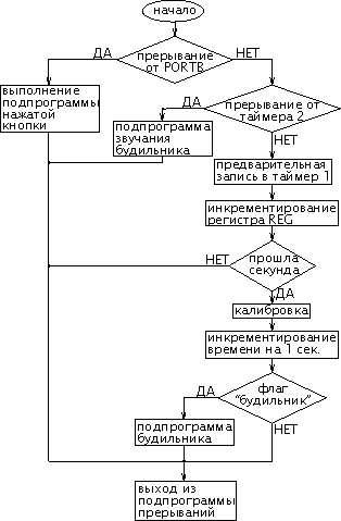 Рассмотрим работу устройства согласно блок-схеме. Как уже говорилось выше, данная программа - только программа прерываний, т.е. основной программой может быть что угодно. При нажатии одной из кнопок происходит прерывание по порту В, и выполняется соответствующая подпрограмма прерываний. Таймер 2 служит для реализации сигнала будильника. При его переполнении происходит инвертирование сигнала на выводе №13, что и является причиной звучания динамика. Для отсчета времени используется таймер 1. При его переполнении происходит инкрементирование специального регистра REG, при достижении которым определенного числа, текущее время инкрементируется на 1 секунду. После этого происходит подстройка хода часов, в соответствии с введенным коэффициентом. Если включен будильник, то происходит проверка на соответствие текущего времени со временем срабатывания будильника, и если время совпадает, то подается звуковой сигнал. Рассмотрим работу устройства согласно программе в файле clock.asm. В начале программы разрешаются прерывания от PORTB и таймеров 1 и 2, но таймер 2 выключен. Интервал времени в 1 секунду получается следующим образом: Частота тактового генератора = 9МГц. Частота командных циклов = 9/4=2,25МГц, следовательно, за 1 секунду пройдет 2250000 командных циклов. Программа построена таким образом, что при переполнении таймера 1, происходит инкрементирование регистра REG (который состоит из двух регистров REG1 и REG2), а после достижения регистром REG определенного значения, происходит увеличение текущего времени на 1 секунду, т.е. Nt*Nreg=2250000, где Nt - количество циклов до переполнения таймера 1, а Nreg - количество переполнений таймера 1, которое хранится в регистре REG. В данном случае, Nt=3600 (H'0E10'), а Nreg=625. Для этого в таймер 1 надо предварительно записать число H'FFFF'-H'0E10'=H'F1EF'. Однако, следует еще учесть командные циклы, которые пройдут до предварительной записи числа в таймер 1, поэтому записываемое число будет равно H'F1FB'. После того как прошли 2250000 командных цикла происходит прерывание по таймеру 1, т.е. переход на метку "PRER_T1". После этого считываются значения из регистров "T1H" и "T1L" и записываются в регистры таймера 1. Затем инкрементируется регистр "REG". Если он =D'312', следовательно прошло полсекунды, и вызывается п/п "моргания" ("FL_LCD"). Если регистр "REG"=D'625', значит прошла 1 секунда, иначе выход из п/п прерываний. Потом регистр "REG" обнуляется, а в регистры "T1H" и "T1L" записывается начальное значение, а после этого добавляется значение из регистра "CALIBR". Калибровка хода часов получается следующим образом: К предварительно-записываемому числу в таймер 1 прибавляется (или, а зависимости от флага "MINES", отнимается) число из регистра калибровки "CALIBR". Так как в часе 3600 секунд, то получается, что число в регистре "CALIBR" соответствует количеству секунд, на которое часы будут "убегать" или "опаздывать" за час.После этого происходит инкрементирование единиц секунд. Если единицы секунд становятся равными 10 (правый полубайт регистра "SEC"), то они обнуляются и инкрементируются десятки. Если десятки секунд равняются 60, то они тоже обнуляются и инкрементируются единицы минут и т.д. вплоть до десятков часов. После инкрементирования времени на 1 секунду, новое значение следует вывести на индикацию (п/п "LCD_TIME"), однако, если в текущем режиме этого делать не надо (например, режим калибровки или будильника) тогд