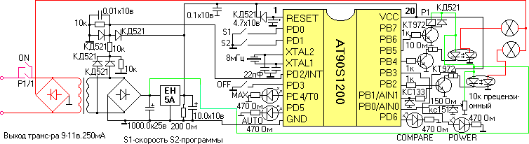 Свечение индикатора COMPARE говорит о том, что включен компаратор и при превышении напряжения в сети 240 В произойдет принудительное отключение всего адаптера. Для отключения компаратора необходимо удерживать кнопку S2 перед включением питания. Состояние компаратора не запоминается, при каждом новом включении компаратор будет включаться автоматическими для его отключения придется повторять вышеописанные действия. Нажатием на кнопку S1 производится изменение скорости выполнения текущего эффекта. Изменение скорости происходит циклически, каждое новое нажатие приводит к уменьшению скорости, а при достижении минимальной скорости снова включается самая высокая скорость. Текущее состояние скорости регулируется и запоминается независимо для каждого эффекта. При последующем включении адаптера восстанавливается последнее значение скорости для каждого эффекта. Нажатием на кнопку S2 производится выбор текущего эффекта. При каждом шестом нажатии будет загораться индикатор AUTO, свечение этого индикатора говорит о том, что все эффекты выполняются в автоматическом режиме друг за другом. При этом каждый эффект повторяется по 100 раз. В программе на сегодня заложено пять эффектов. Каждый эффект тщательно подобран и продуман. Во всех эфектах не происходит полное гашение лампочек благодаря чему отсутствует неприятное моргание. В каждом из пяти эффектов реализована Функция перелива. Конечно, использование всего двух каналов не дает возможности реализовать "бегущую волну", и тем не менее выглядит все очень красиво.