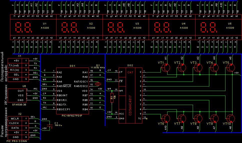 Модуль предназначен для вывода информации на 10-и позиционный светодиодный индикатор и приема информации о нажатии кнопок на инфракрасном пульте дистанционного управления (ПДУ) стандарта RC5, таким образом являясь контроллером дисплея клавиатуры.