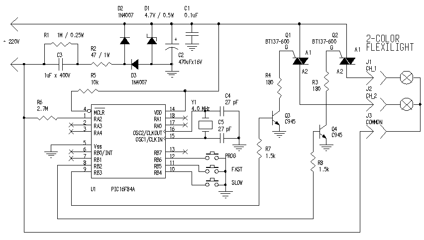 Контроллер используется со световым шнуром Flexilight для получения различных динамических световых эффектов. Flexilight - гибкий материал для световой рекламы, альтернатива "неоновой" рекламе. Выполнен из цельной ПХВ трубки диаметром ~12 мм, заполненной миниатюрными лампочками с шагом ~25 мм. Обычно используется для декорации и подсветки углов зданий, дорог, лестниц, создания надписей, картинок и т.п. Контроллер обеспечивает плавное изменение яркости в цветовых каналах. Имеются три кнопки управления: две кнопки - изменение скорости выполнения эффектов (быстрее - FAST, медленнее - SLOW) и третья кнопка для переключения между эффектами (PROG). Эффекты переключаются по кругу: 1-2-3-..-1-2-3-.. Контроллер имеет простой внутренний язык описания эффектов, что облегчает их написание.