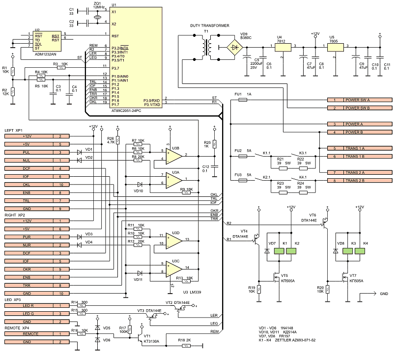 Сигнал дистанционного управления поступает с разъема XP4 на защитную цепочку R16VD5VD6, далее на эмиттерный повторитель на транзисторе VT1. Включается усилитель сигналом логической единицы в формате TTL на входе REMOTE. Необходимо отметить, что сигнал дистанционного управления не случайно поступает на вход прерывания микроконтроллера INT0. Это позволяет при необходимости реализовать ИК дистанционное управление непосредственно усилителем мощности. Для этого достаточно на вход REMOTE подключить интегральный фотоприемник, а в программу добавить текст декодера. В текущей версии программы декодер отсутствует.