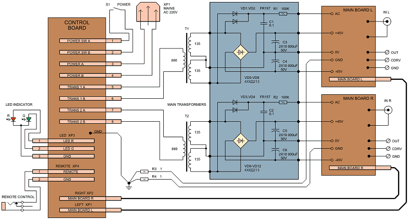 Общая схема соединений усилителя показана на рис. 4. В отличие от предыдущей версии усилителя, вся система управления теперь собрана на одной плате (Сontrol Board), к которой через разъемы XP1 и XP2 с помощью плоского кабеля подключены основные платы (Main Board L и Main Board R). К винтовым зажимам 1 и 2 платы управления подключен сетевой выключатель, который установлен на передней панели. Этот выключатель может быть рассчитан на небольшой ток, так как он коммутирует только первичную обмотку дежурного трансформатора. К зажимам 3 и 4 подключен сетевой разъем, который находится на задней панели. Зажимы 5 – 8 предназначены для подключения первичных обмоток основных трансформаторов. Через разъем XP3 подключен двухцветный светодиод, который смонтирован на небольшой платке на передней панели. Разъем XP4 служит для подключения 3.5-миллиметрового гнезда дистанционного управления, которое размещено на задней панели.