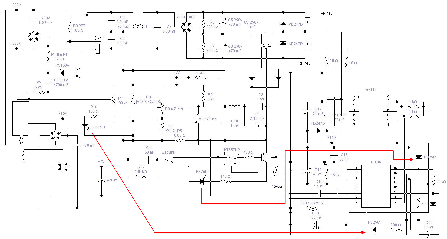 шунтирующие трансформатор Т1 и транзисторы IRF740