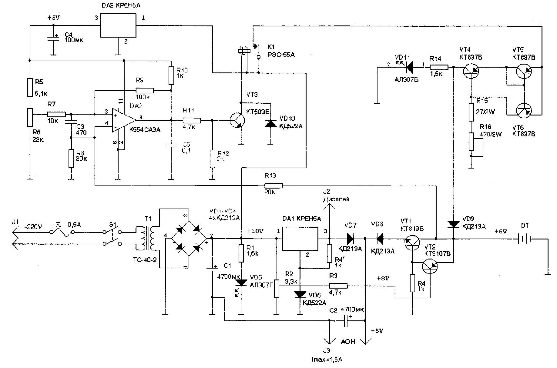 Схема (см. рисунок) состоит из нескольких функциональных узлов. Трансформатор Т1, диодный мост VD1-VD4, фильтрующие конденсаторы С1 и С2, интегральный стабилизатор DA1 и диод VD7 образуют стандартный стабилизированный блок питания АОНа с выходным напряжением 5 В и током нагрузки 1-1,5 А. Диод VD6 и резистор R4' включены, чтобы повысить выходное напряжение DA1 примерно до 5,6 В, что компенсирует его падение под номинальной нагрузкой но диоде VD7. На транзисторах VT1, VT2 и диоде VD8 собран электронный ключ, который при исчезновении или значительном снижении сетевого напряжения мгновенно подключает к выходу блока питания аккумуляторную батарею ВТ. На микросхемах DA2, DA3, транзисторах VT3-VT6 и реле К1 собрано автоматическое зарядное устройство для подзарядки аккумуляторной батареи.