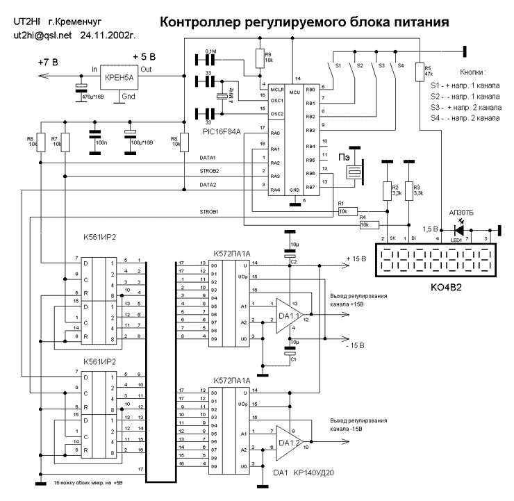 Контроллер блока питания Рис.1 реализован на популярном контроллере PIC16F84A. Можно применить более дешевый PIC16С84. Так как в его составе нет цифроаналогового преобразователя, применен отечественный ЦАП К572ПА1А на каждый канал регулирования.
